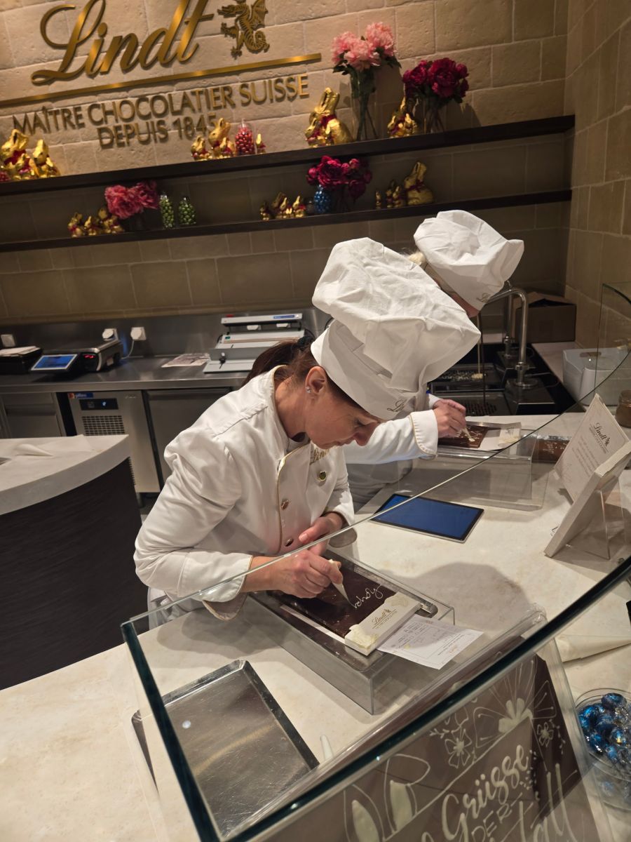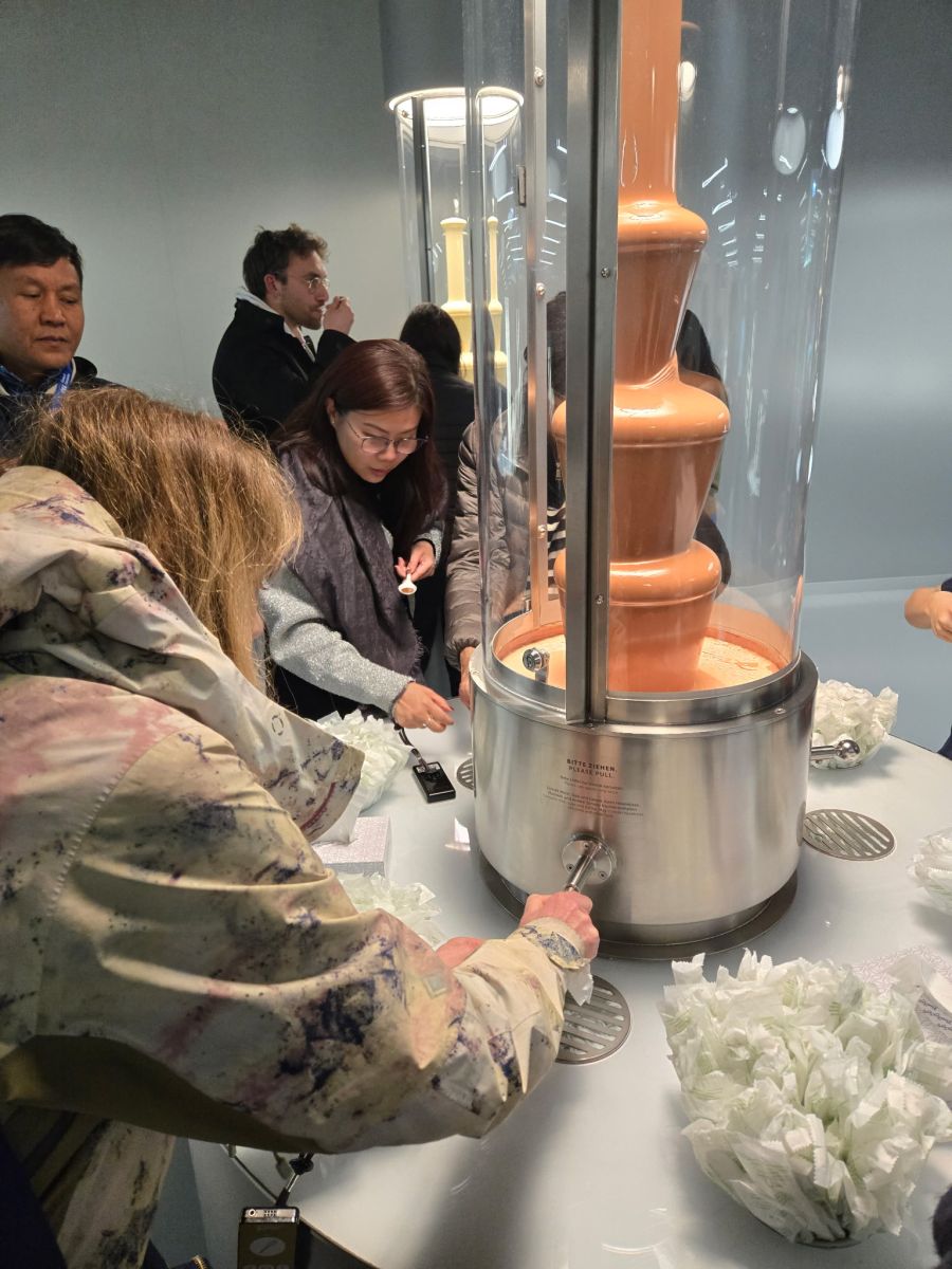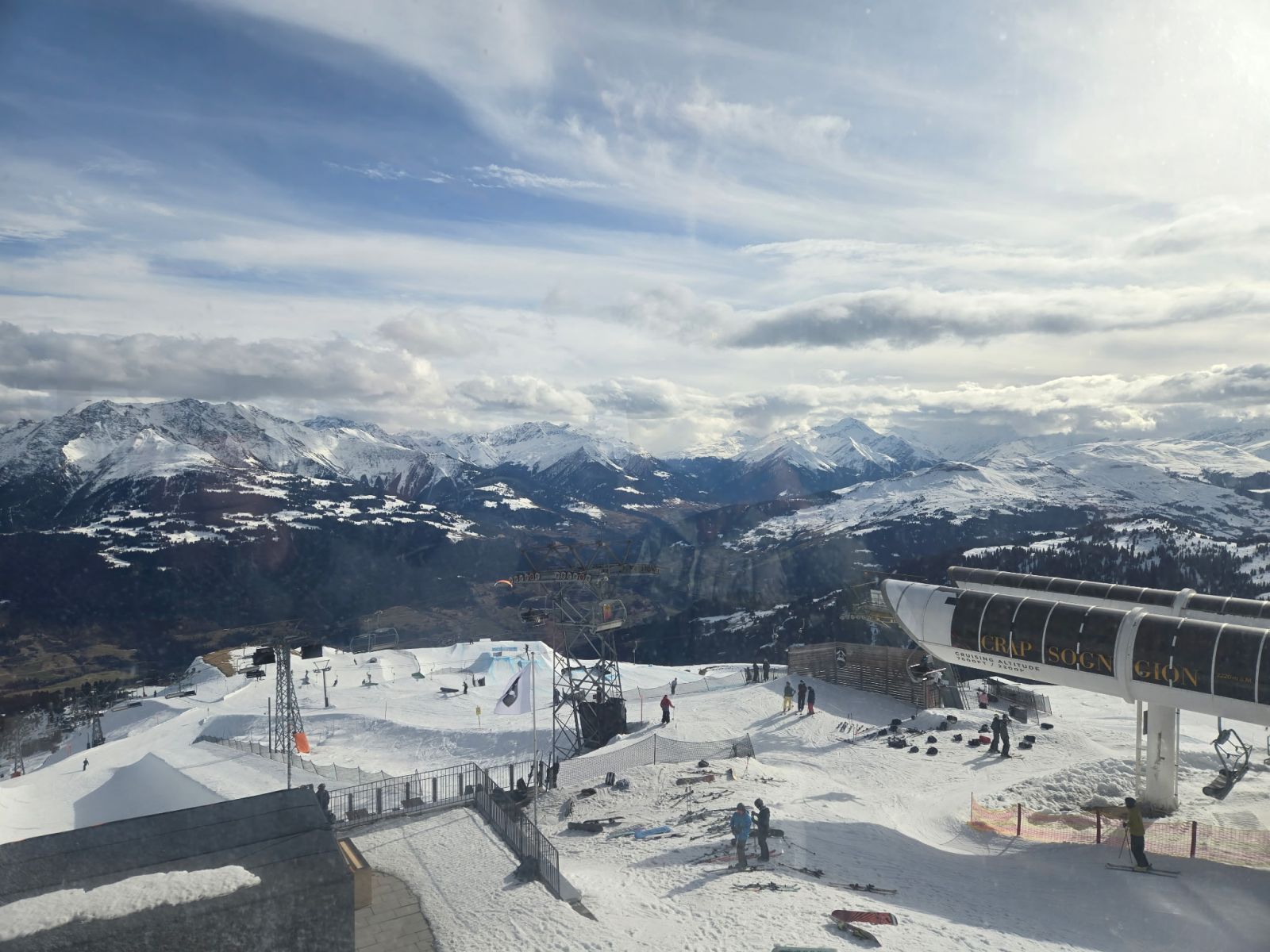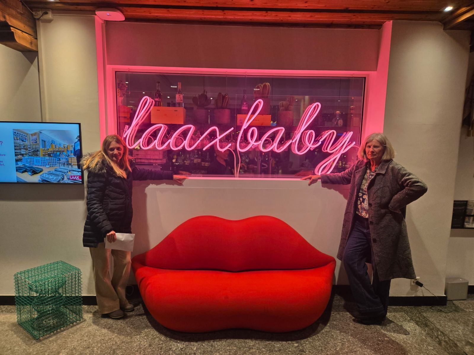 Our European trip afforded 29 adventurous OC members the opportunity to experience beautiful mountains, a modern European culture, interesting ski lifts, varied and delicious culinary experiences ,and an environmentally conscious lodging style. Laax is the unofficial snowboarding capital of Europe and has a distinctly youthful and funky vibe. There was a variety of terrain for skiing. At the top of the mountain, we encountered fluffy powder and packed powder conditions. From the midstation and lower, we had spring-like conditions with soft snow. All of the areas gave us a beautiful view. We giggled at the name of the midstation, “Crap Sogn Gion” (see photo below). Translated from Romansh, the least-spoken language of the four official languages of Switzerland (the others are German, French and Italian), it means St. John’s Stone (Peak). Laax is known for its snow parks and halfpipes which host several competitions. These areas could be seen from the chairlifts and midstation cafeteria. The abilities of the riders were very impressive. The “flytrap” effect of these areas meant that the other95% of the resort was left to the skiers. Everyone coexisted happily and peacefully at the resort. Our hotel boasted a vegetarian breakfast. Although many of us were wary of what we would be served, our fears were allayed. The buffet offerings were plentiful, interesting and delicious. Five of the 7 group dinners were in 4 different restaurants within walking distance. We enjoyed the esprit de corps of these 5 delicious dinners and shared our tales of each day’s adventures. Other adventures included fun lifts: the Lavadinas 6-pack lift designed by Porsche, the FlemExpress – the world’s only on-demand 10-person lift which takes you only to your destination, bypassing stops along the way – and the V-shaped Four cla lift which would transport you to a different mountain peak than you intended if you entered the gondola building on the wrong side. We also enjoyed the tree-top walk, the shopping, and the Cadillac photobooth, which peeled away several decades to reveal our younger, more attractive selves. Or at least, how we remember ourselves.Nine from our group returned to the USA and 20 of us continued to Zurich. We had a comprehensive city tour and boat ride across the lake. Many of us enjoyed spending additional time in the Lindt Museum of Chocolate. The samples were plentiful and delicious. As the Swiss trains were easy to navigate some folks ventured on to Basel, Munich and Luzern. If you had enough francs and luggage space, the shopping experience was wonderful. Overall, the trip was great not only for skiing but for the cultural experience.
